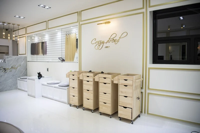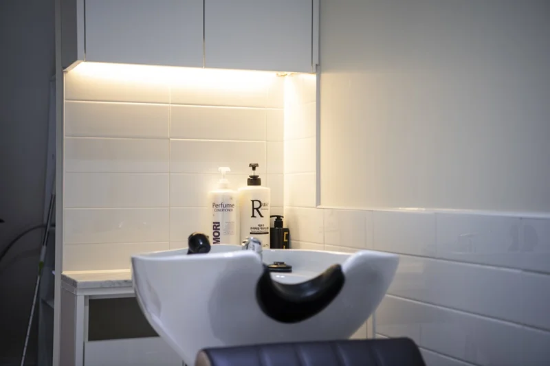샴푸존은 프라이빗한 분위기를 위해 약간 분리된 공간으로 설계하고, 골드 수전으로 포인트를 주면 고급스러움이 배가됩니다. 마지막으로 수납 공간은 내장형으로 디자인하여 공간의 깔끔함을 유지하는 것이 좋습니다. 고급스러운 소형 미용실디자인을 비용 효율적으로 만들기 위해서는 전략적인 접근이 필요하죠. 제한된 예산으로 최대의 효과를 내기 위해 핵심 포인트 공간에 예산을 집중 투자하는 것이 좋습니다. 리셉션과 같이 고객이 첫인상을 받는 공간, 또는 샴푸존과 같이 고객이 오래 머무는 공간에 우선적으로 투자하면 효과적입니다.