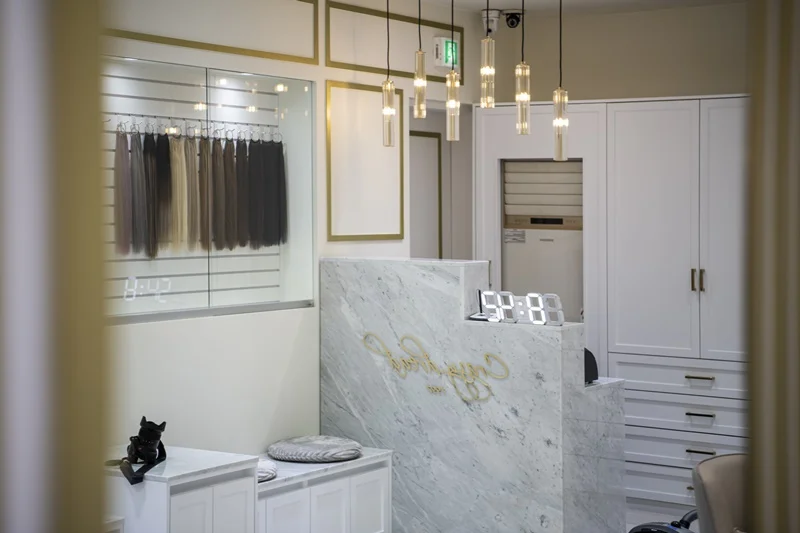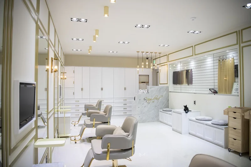 가산동은 IT 기업과 젊은 직장인이 많은 곳으로, 상가인테리어 트렌드도 세련되고 현대적인 디자인이 주목받고 있습니다. 10-20평대 소형 미용실에서는 제한된 공간을 어떻게 활용하느냐가 성공의 열쇠입니다. 이런 상황에서 골드와 화이트 조합은 최적의 선택이라 할 수 있습니다. 특히 2025년 미용실 인테리어 트렌드는 ‘미니멀 럭셔리’에 초점을 맞추고 있습니다. 불필요한 장식은 줄이고 핵심 요소에만 고급스러움을 더해 공간의 가치를 높이는 전략이 주목받고 있어 골드와 화이트의 조합이 더욱 빛을 발하고 있죠.