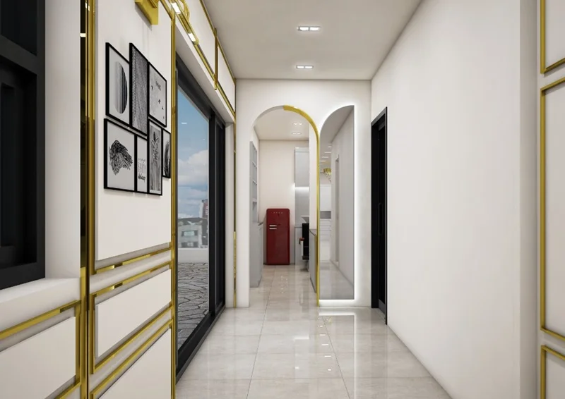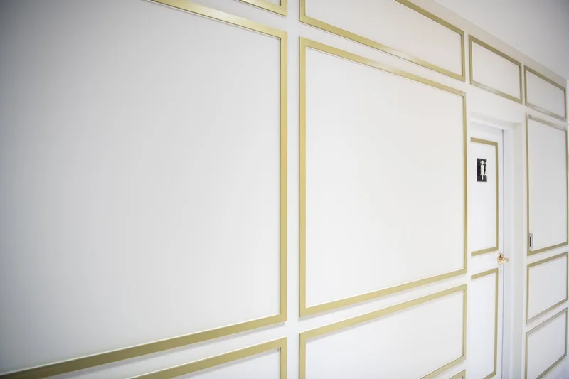 내부 인테리어에서는 거울 프레임과 조명 기구에 골드 악센트를 적용하는 것이 효과적입니다. 또한 수전, 도어 손잡이 같은 작은 소품에도 골드 컬러를 적용하면 디테일에 신경 쓴 인테리어라는 느낌을 줄 수 있습니다. 가구의 라인이나 몰딩에 골드 디테일을 더하는 것도 공간의 품격을 높이는 방법입니다.