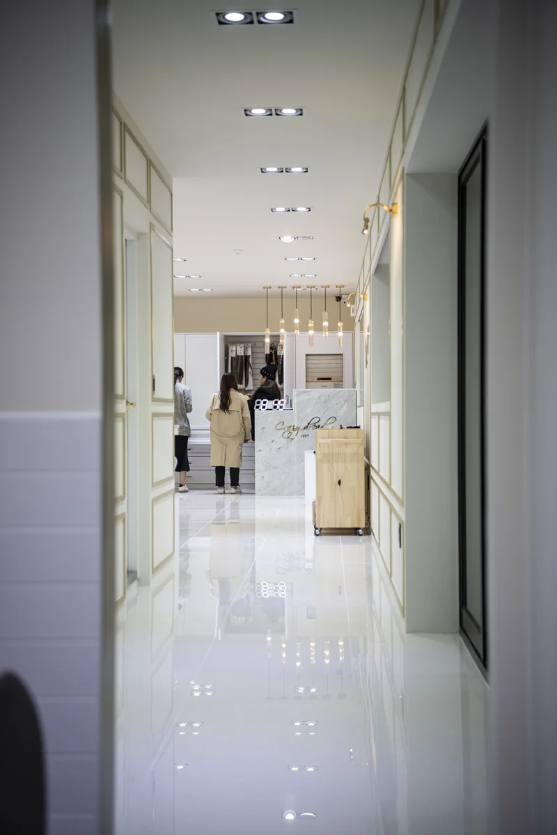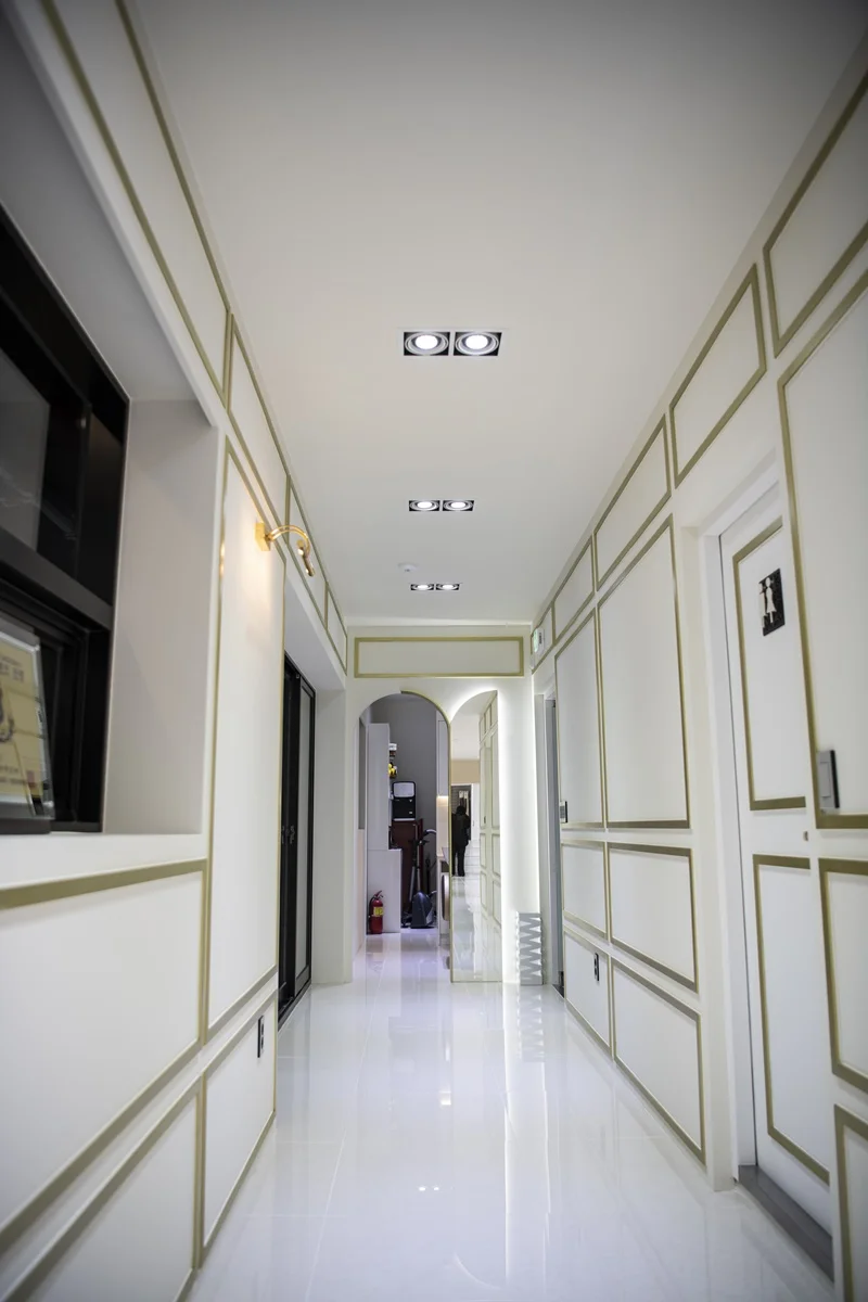 원형 조명과 골드 프레임 조명은 시각적 포인트를 만들어 공간에 개성을 더해줍니다. 특히 리셉션 카운터 위나 대기 공간에 특색 있는 조명을 설치하면 브랜드 이미지를 강화하는 데 도움이 됩니다.
