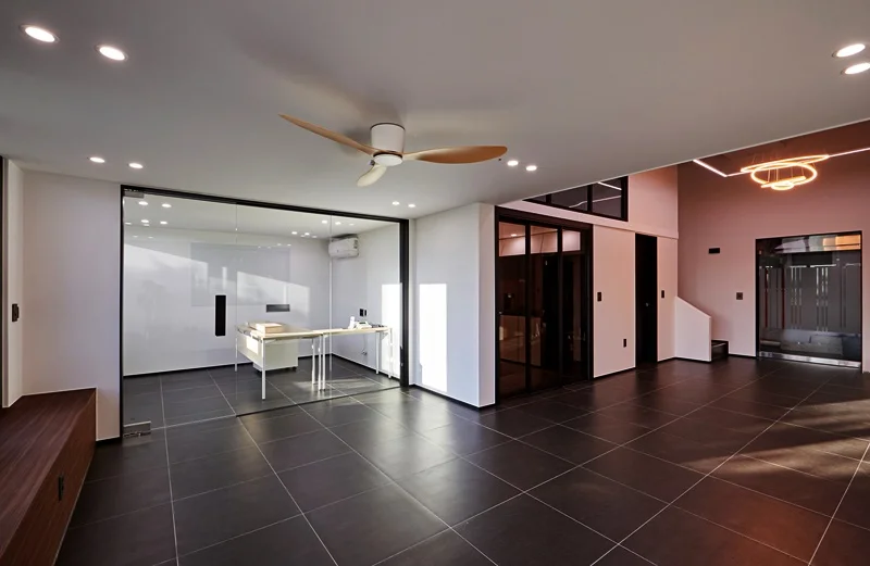 회사의 주방 공간은 블랙&화이트 대비를 중심으로 구성해 전체 디자인 콘셉트와 통일감을 유지했어요. 반듯한 라인으로 구성된 조리대와 수납장은 미니멀 디자인의 장점을 고스란히 담고 있으며, 은은한 간접 조명을 더해 전문적인 느낌까지 나죠. 또한 슬라이딩 유리 도어를 통해 주방과 업무공간 사이의 경계를 명확하게 유지하면서도 개방감은 잃지 않는 구조가 완성됐어요.