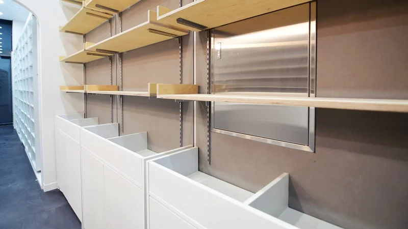 리셉션 뒤는 약사와 직원의 핵심 업무공간이자 약품 관리의 중심입니다. 여기에는 실용성과 정돈미를 강조한 매립형 진열장과 하부 수납장이 설치되었습니다. 이 공간은 약국의 실질적인 업무 효율을 높여주는 설계 포인트입니다.