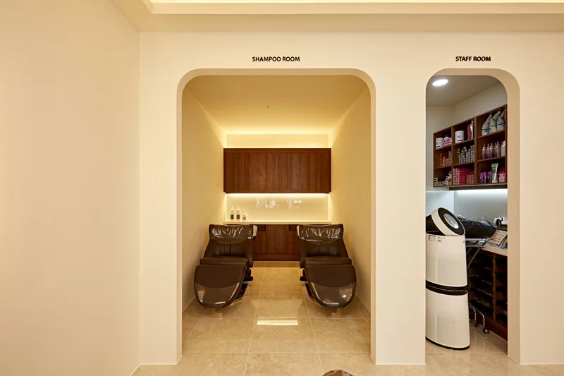 샴푸실은 고객들이 편안하게 누워서 샴푸를 받을 수 있도록 독립적인 공간으로 구성했습니다.