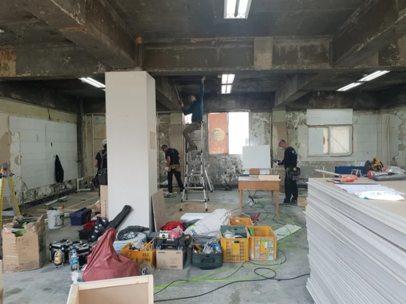 공사의 첫 단계는 기존 공간의 철거 작업입니다. 헤어샵으로 리뉴얼되기 전, 기존 상가 공간의 천장 마감재, 벽체 몰딩, 타일 바닥, 기존 경대 및 수납장까지 전면 철거를 진행하였습니다. 기존 텍스 천장과 석고보드, 전기배선, 노후 레일 등을 모두 철거하고, 배관 및 구조물 상태를 확인한 후 오픈천장 구조로 변경하기 위한 사전 작업을 진행했습니다.