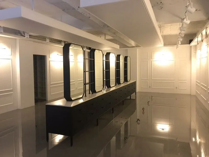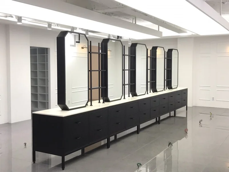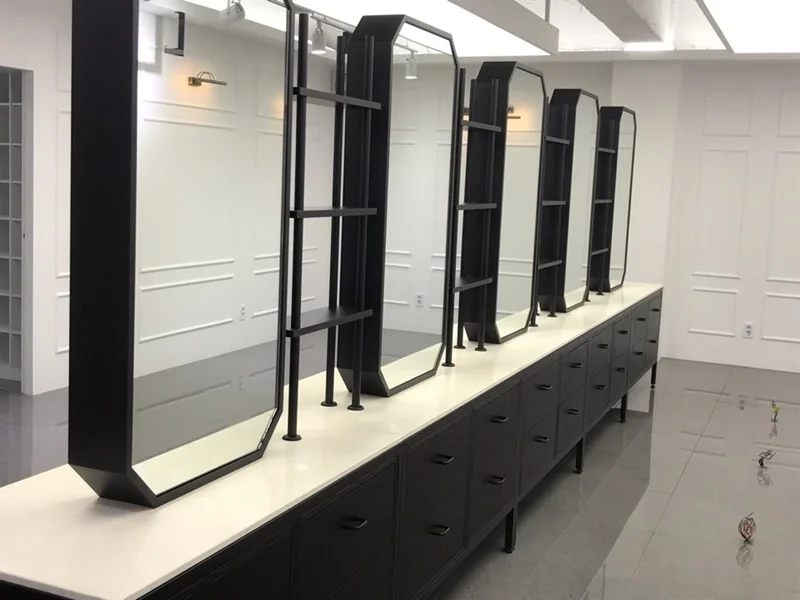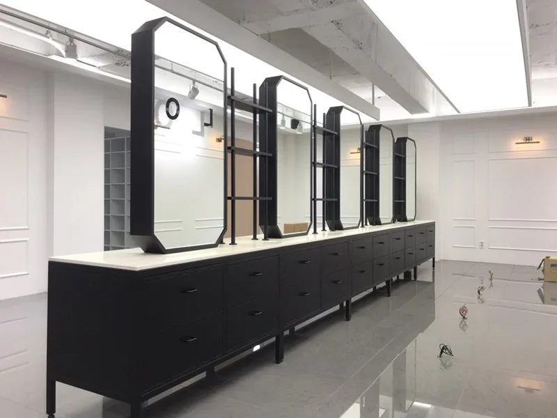 서랍장은 심플한 매트 블랙 컬러로 제작하여 경대와 일체감을 주었으며, 넉넉한 수납공간을 확보해 직원들의 작업 동선을 원활하게 해주었습니다. 또한 상부 조명은 라인 매립등과 스포트라이트로 고객의 얼굴에 자연스러운 톤을 살릴 수 있도록 색온도와 조도까지 꼼꼼히 세팅하였습니다.