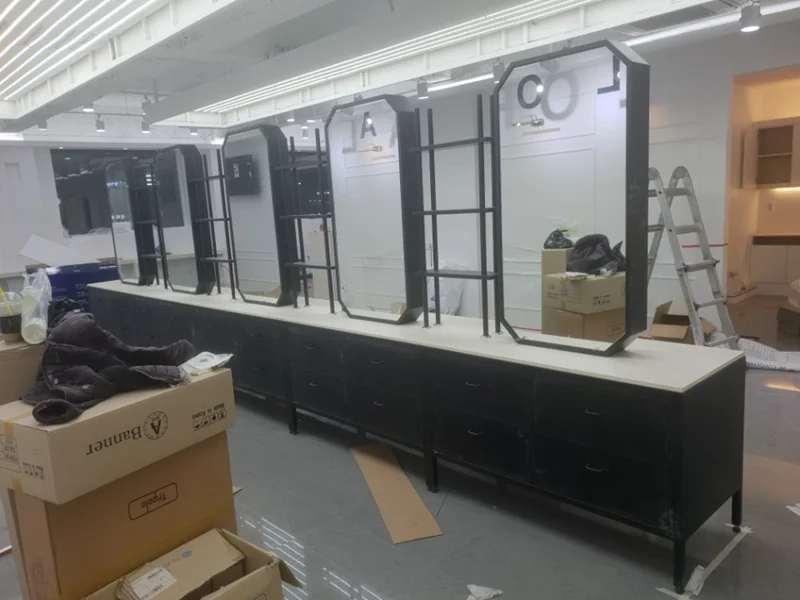 헤어샵의 핵심 공간인 경대 작업은 디자인과 실용성을 동시에 고려해 세심하게 시공했습니다. 각진 형태의 블랙 메탈 프레임을 주문 제작해 경대 거울을 둘러싸도록 디자인하고, 프레임 안쪽에 간접조명 라인을 삽입하여 고객 얼굴을 자연스럽게 밝혀주는 효과를 구현했습니다.