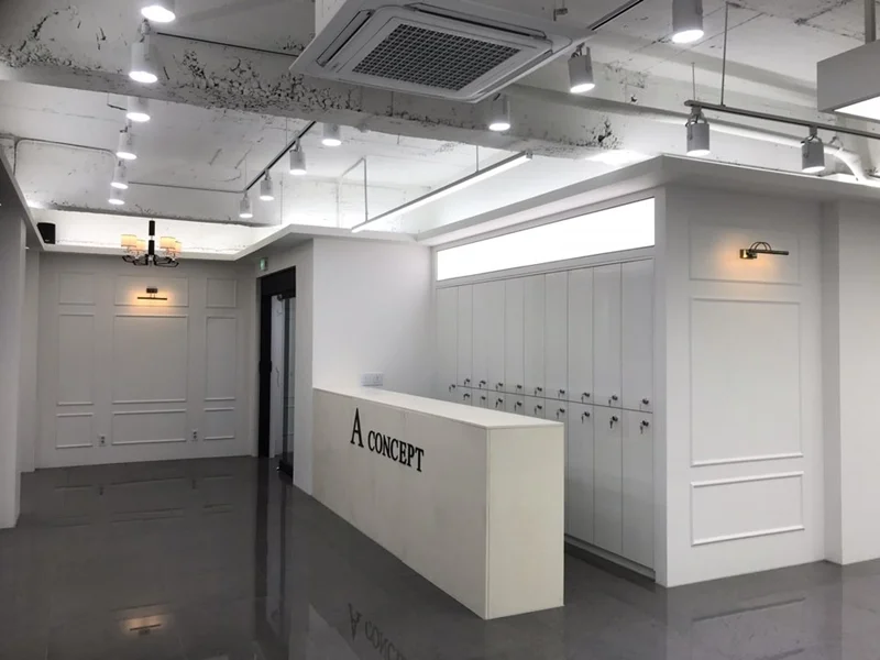 리셉션 데스크는 심플하면서도 브랜드 정체성을 명확하게 전달할 수 있도록 ‘A CONCEPT’ 로고를 전면에 배치하고, 단단한 마감과 깨끗한 컬러로 안정감을 줍니다. 리셉션 뒤쪽에는 화이트 락커장을 설치하여 고객과 직원의 개인 물품 수납이 가능하도록 실용성도 더했습니다. 락커 상부에는 은은한 간접조명을 시공해 공간의 답답함을 해소하고 세련된 분위기를 완성했습니다.