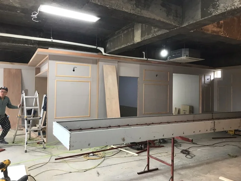 헤어샵의 분위기를 결정짓는 몰딩 벽면과 경대 하부장, 락커장 등은 목공 작업으로 제작되었습니다. 화이트 몰딩 자재를 폭과 간격을 동일하게 커팅하고, 벽면 석고보드에 부착하여 클래식하면서도 균형 잡힌 벽면 디자인을 완성했습니다. 목공 작업과 동시에 천장 구조물에 레일조명, 스포트라이트, 라인조명 매립형 프레임을 고정할 수 있도록 보강 작업을 마쳤습니다.