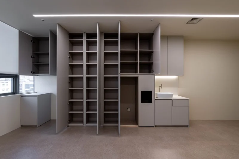 수납 공간과 편의 시설 역시 미니멀오피스의 철학을 그대로 이어받아 설계되었습니다. 복도를 따라 길게 배치된 맞춤형 수납장은 손잡이가 없는 푸시 타입 도어를 채택하여 벽면과의 일체감을 극대화했으며, 도어를 닫았을 때는 마치 인테리어 벽면의 일부처럼 보이도록 마감되었습니다.