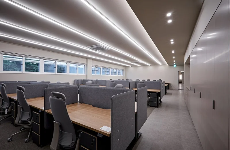 또 바닥과 천장은 화이트 컬러로 마감하여 공간이 넓어 보이도록 했고 조명은 밝고 화사한 LED 조명을 설치하여 업무 효율을 높일 수 있도록 했습니다.